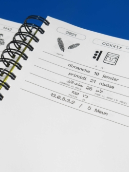 L'AGENDA est un projet de l'artiste Sophie de Bayser qui rassemble et confronte les calendriers grégorien, républicain, hégirien, hébraïque, chinois, maya, celte, lunaire & unix. Toutes ces différentes perceptions du temps se retrouvent sous la forme d'un agenda journalier (1 page / 1 jour) dans lesquelles il est possible d'y inscrire ses notes. En index figure des explications sur la création de ces calendriers, des principales fêtes ainsi que la signification des signes astrologiques.